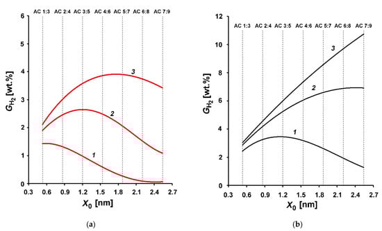 It follows from the data in Figure 3a for gravimetric hydrogen capacities at room temperature that the GH2 = f(X0) functions had a maximum. With an increase in pressure, the width of the maximum increased, and its position shifted towards the wider pores. The decrease in temperature resulted in the transformation of the extremal dependences of GH2 = f(X0) to the increasing ones over the entire pressure range (Figure 3b,c). More specifically, it can be noted that at room temperature and the pressures of 10 and 20 MPa, the structures with small pore sizes in the range of 0.6–0.7 nm were the most optimal adsorbents for hydrogen storage, whereas, at 27 MPa, the highest hydrogen density was achieved in the structures with the pore sizes of about 1.8 nm (AC 5:7). It should be noted that with a decrease in temperature to 77 K (Figure 3c), except for AC 1:3, all other model structures demonstrated a gravimetric capacity exceeding the DOE target value. In other words, a high gravimetric density of adsorbed hydrogen in the model carbon structures resulted from an optimum combination of the SEC values and thermodynamic parameters (pressure and temperature) of the storage system.
