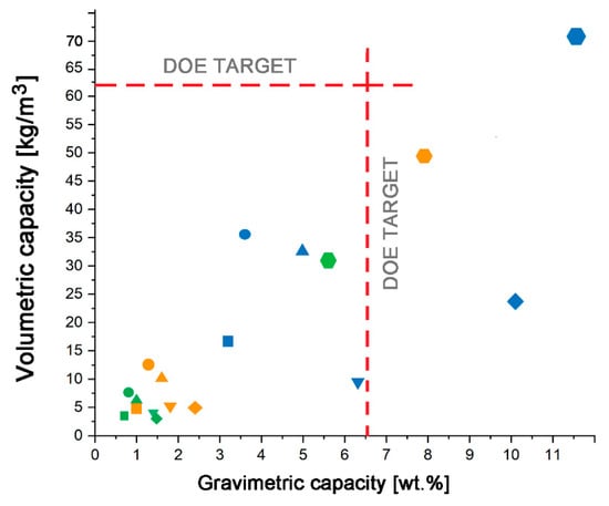 Figure 1 demonstrates a diagram of the physical adsorption-based hydrogen storage systems using various nanoporous carbon materials compared with the target density and that provided by compressed storage. We do not show the excellent data for hydrogen adsorption capacities demonstrated by MOFs and COFs [24,25,26] due to technical challenges to scaling up their manufacturing.
