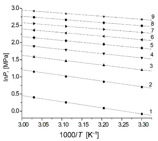 According to Equation (9), the value of qst for the studied adsorption systems could be calculated from the experimental isosteres of hydrogen adsorption. Figure 6 demonstrates the isosteres of hydrogen adsorption on the carbon adsorbents.