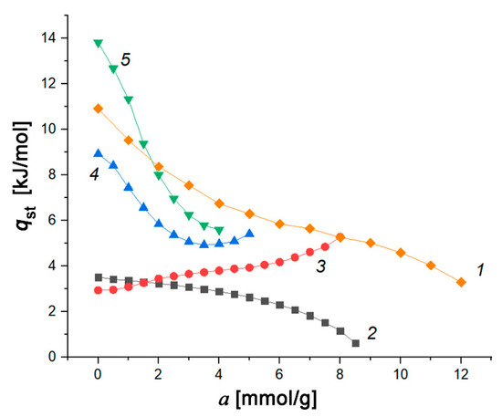 According to the definition [71,72], the differential molar isosteric heats of adsorption, qst, is determined as a difference between the molar enthalpy of the gas phase, hg, and differential molar enthalpy of the adsorption system, :