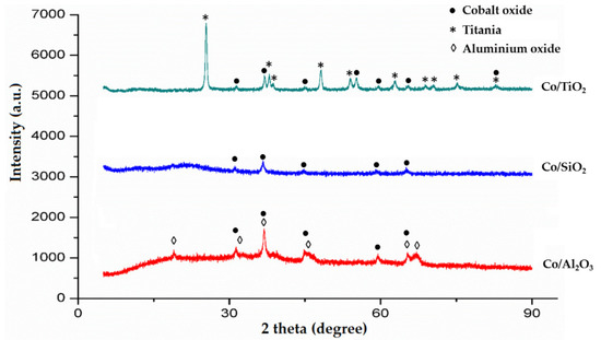 In this work, three kinds of supports, TiO2, SiO2, and Al2O3 were used for the preparation of the 15% Co/support catalysts. The catalysts were prepared via incipient wetness impregnation of cobalt nitrate solution (Co(NO3)2·6H2O) onto these three kinds of supports. The chemicals used were outsourced from Sigma-Aldrich (St. Louis, MO, USA). Catalysts were dried at room temperature overnight, followed by mild drying at 40 °C for 3 h and calcination at 350 °C for 8 h. For, the detailed preparation procedure, please refer to our earlier publication [27].
