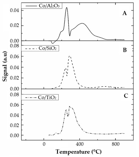 The TPR reduction profiles presented in Figure 3 for the three kinds of catalysts showed two reduction peaks, which were similar to those observed for bulk Co3O4 oxide. These profiles point to a two-step reduction process: the first one of low intensity started at approximately 200 °C and overlapped with the more intense second peak whose maximum occurred at about 300 °C for Co/TiO2 and Co/SiO2 catalysts, and for Co/Al2O3, the peak started around 300 °C and the second peak emerged at around 450 °C. Other than the fact that the second reduction peak for the Al2O3-supported catalyst emerged at a higher temperature than the second peak on the TiO2- or SiO2-supported catalysts, it also extended its shoulder to a higher magnitude, in this case 700 °C. Therefore, the reduction process of Co3O4 can be described by the reduction of Co3+ ions present in the spinel structure of a fresh catalyst into Co2+ with subsequent structural change to CoO, followed by the reduction of Co2+ ions to Co0 metal. The results observed over the Al2O3-supported sample suggests that the catalyst supported on Al2O3 is harder to reduce than the one supported by TiO2 or SiO2, which may have been due to strong metal–support interactions, which is in line with the literature [11,12].