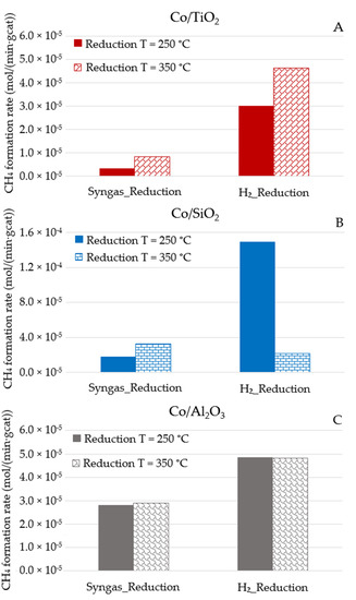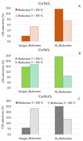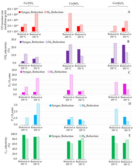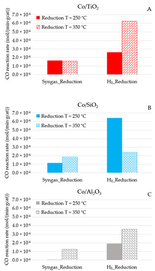The CO reaction rates were found to be higher at a higher reduction temperature (350 °C) for all the samples, except for the syngas pre-treated TiO2-supported sample and H2-pre-treated SiO2-supported sample. The SiO2-supported catalyst showed higher reaction rates at 250 °C compared to 350 °C (see Figure 4B). Our previous work over the SiO2 sample demonstrated the effect of Co–CoO bonding promoting the FT reaction, thus leading to a higher FT reaction rate at a lower reduction temperature (250 °C), when the CoO density is higher than the density observed at 350 °C [27].