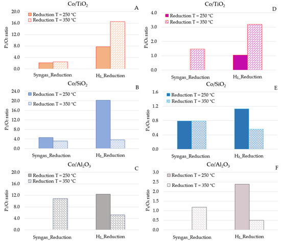 P/O ratio is a very important factor that reflects the selectivity of the paraffin (P) and olefin (O) products—a higher P/O ratio represents the products that are more paraffinic and a lower value indicates a higher selectivity to olefinic products. Pn/On represents the parafin to olefin ratio with carbon number n. In the current work, the ratios of P2/O2 (ethane/ethylene) and P4/O4 (butane/butene) are reported in Figure 9 for the catalysts either reduced by syngas or H2 at different reduction temperatures. For the Co/TiO2 catalyst, pre-treatment with syngas (at both 250 and 350 °C) produced more olefins than paraffins compared to the H2 pre-treatment (low P/O ratios). For Co/SiO2, similar results as for the Co/TiO2 catalyst—lower P/O ratios were obtained for syngas-reduced catalysts compared to H2 reduction at 250 °C. However, syngas pre-treatment at 350 °C produced more paraffin products over the Co/Al2O3 catalyst compared to H2 pre-treatment at a similar reduction temperature.