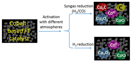 Catalyst pre-treatment is a way to transform cobalt oxides to active sites. For H2 reduction, cobalt oxides are reduced to metallic Co0; in the meantime, there is still some cobalt oxides (Co3O4 and/or CoO) left due to partial reduction depending on the reduction temperature or the extent of metal–support interactions. For syngas (a mixture of H2/CO) reduction, the presence of CO in the mixture can also react with the cobalt oxides to form cobalt carbides (CoxC), which has been confirmed by Peacock et al. [29] and Claeys et al. [30] using the in situ magnetometer. In addition, the Boudouard reaction (2CO = CO2+ C) may occur when the operating temperature is high. Figure 11 lists the possible cobalt phases after cobalt catalyst reduction under different atmospheres.