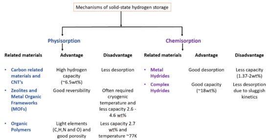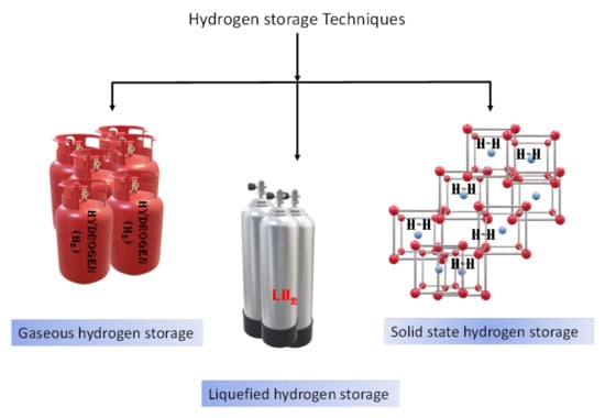 The search for clean and abundant energy sources to compete with fossil fuels brings us to hydrogen as a next-generation energy carrier. Hydrogen is a promising alternative energy carrier as a long-term solution with the only product as water and not CO2. To establish hydrogen infrastructure, its efficient storage is warranted. There are several technologies available in the market for hydrogen storage, but these technologies are still not good in terms of cost and handling, which are critical issues. To guide the technological and scientific community, the U.S. Department of Energy (DOE) set targets for onboard hydrogen storage to achieve the required capacity by the year. For example, 5.5 wt% gravimetric capacity or a 40 g H2/L volumetric capacity is the target by the end of 2025, whereas it is set to be 6.5 wt% gravimetric capacity or a 55 g H2/L volumetric capacity as ultimate target [1]. The technologies involved in hydrogen storage are liquefied hydrogen storage, gaseous hydrogen storage and solid-state hydrogen storage as shown in Figure 1. Hydrogen in the liquid state requires more than twice the space in comparison to gasoline to run the car up to 300 miles. In the gaseous state, hydrogen is even more complicated to handle, with the cost more than 4–5 times of the gasoline storage [2]. Hydrogen storage in the compressed state needs heavy and large cylinders with special coatings which add more cost to the method. In addition, the safety risks due to high pressure cannot be avoided. Thus, both techniques, i.e., compressed hydrogen gas and low-temperature liquefied hydrogen gas, have their own disadvantages and are unrealistic for commercial use. Consequently, researchers have been attracted by solid-state hydrogen storage in materials due to its high gravimetric and volumetric capacities, ease of handling and safety. In the last few years, researchers have been more focused to achieve the DOE targets and to understand the hydrogen de/adsorption properties of physically and chemically bounded hydrogen in solid materials. The mechanism of solid-state hydrogen storage materials can be classified based on the state of hydrogen in the materials, i.e., physisorption (physically bounded hydrogen) and chemisorption (chemically bounded hydrogen). In physisorption, molecular hydrogen is adsorbed onto the surface of the material by the weak van der Waals interactions. Due to the weak interaction of the nonpolar hydrogen molecule with the adsorbent surface, it is easy to desorb hydrogen at high temperature. To avoid this quick release of hydrogen, cryogenic temperatures (~77 K) are usually applied for the hydrogen storage process [3]. However, room temperature hydrogen desorption for storage and onboard vehicular applications is desired and difficult to achieve. As we can see in Figure 2, physisorption systems commonly attract attention due to their porous structures and high surface area. For example, carbon-related materials and carbon nanotubes (CNTs) were investigated because of their high surface area and high capacity up to 6.5 wt%, but due to desorption at low temperature, these are not suitable practically [4]. Zeolites and metal organic frameworks (MOFs) [5,6] and organic polymers [7,8] have been investigated due to their good porosity and high surface area (low density) which is helpful to increase hydrogen storage capacity. However, the requirement of cryogenic temperature makes them unsuitable for commercial use. On the other hand, in chemisorption, strong chemical interaction occurs between the atomic hydrogen and the solid material (high interaction energy 100–200 kJ mol−1). Hydrogen is stored by strong bonding with the solid material and is released at specified conditions through a chemical reaction. As shown in Figure 2, chemisorption systems include two broad categories, i.e., metal hydrides and complex hydrides.