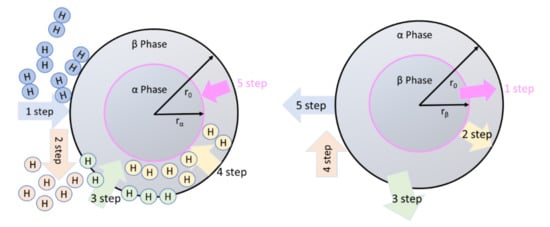 The mechanism of hydrogen absorption and desorption can be understood through several steps as shown in Figure 3. The hydride phase is formed from the metal/gas interface to the center as shown in Figure 3 (left). Initially, hydrogen forms a solid solution (α phase) when a small amount of hydrogen occupies the interstitial sites of the host metal M as shown in the figure. When the hydrogen content is increased further, β-phase is formed with the saturation of the solid solution and hydride phase is formed.