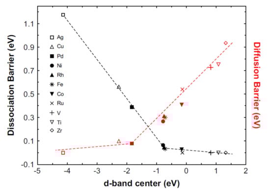 Such a model could help to design more effective catalysts and it has been investigated by many researchers [47,48]. However, experimental evidence showed the reverse of the volcano plot in the case of Mg hydride for hydrogen storage due to several reasons. These include the formation of intermediate magnesium/catalyst phases [49,50], and transportation of atomic hydrogen to the Mg phase by intermediate catalytic phase [51,52] or restricting hydrogen diffusion elsewhere from the catalytic site. Pozzo et al. [53] proposed an inverse volcano plot (Figure 7), combining the effects of hydrogen dissociation and hydrogen diffusion energy barriers mentioned on the y-axis in the figure which is strongly related to the x-axis, i.e., d band center. From the figure, it could be analyzed that Ni and Pd have good catalytic activities but experimentally Ti and V have been found to have good catalytic activity like Ni and Pd [53]. Moreover, we could observe that Ni, Fe and Rh are sitting near the peak of the inverse volcano plot and have the lowest energy barriers, thus the most active catalyst. Therefore, one still needs to analyze and understand the catalytic behavior to develop the effective catalyst for hydrogen de/absorption. Coming towards the second step of hydrogen de/adsorption, i.e., surface penetration, there is an oxide layer (creating MgO/Mg(OH)2) on the surface of Mg/MgH2 due to the small traces of O2/H2O. However, this oxide layer could be caused to vanish during several cycles or by using the efficient catalyst doping. The catalyst could provide active sites to the hydride surface and create a clear path to transport H2 from surface to bulk Mg/MgH2. The process is usually known as the gateway effect as recently discussed by Biasetti et al. [54]. They mentioned that the combined effect of nanosizing and addition of transition metal (TM) as catalyst could improve the kinetics via gateway effect. TM successfully generates an interface of Mg/TM and MgH2/TM that could act as a gateway or spillover mechanism during the de/hydrogenation reactions for Mg/MgH2 [55,56]. Addition of catalyst is not only helpful in providing the path to allow H2 to penetrate into the surface but also helps in accelerating the hydrogen rate in the next step. Due to the partial hydride formation layer, the hydrogen diffusion rate becomes slow in the case of MgH2. For de/hydrogenation it is believed that nanosized catalytic components could alter the sluggish kinetics involved in the hydrogen diffusion step. This mechanism is often famed as the “hydrogen pathway” effect. Friedrichs et al. proposed a “pathway model” through MgH2/Nb2O5 nanopowder system by lowering the oxidation state of Nb2O5 which could help form a pathway to facilitate hydrogen transportation into the sample [57]. There are two important factors to consider here, reduction in particle size and grain size. The reduction of particle size could reduce the diffusion distance which is helpful to enhance hydrogen absorption. However, reducing the grain size may help to obtain more grain boundaries. A greater number of grain boundaries itself could act as a pathway to transport hydrogen, which directly helps to control the slow process of diffusion and enhance the rate of reaction [58]. Moving towards the last step of hydrogen absorption, i.e., nucleation and growth of MgH2 phase, it is still not clear if this is a rate-controlling step or not. Many studies have strongly recommended Johnson–Mehl–Avrami–Kolmogorov (JMAK), which is a suitable nucleation and growth model for many catalyzed MgH2 systems [59,60]. Other diffusion models include “Jander diffusion model” which has been used to fit the kinetics of catalyzed MgH2 systems [41,61,62]. Interestingly, Mooij et al. explained the nucleation and growth mechanisms of nano MgH2 by using the JMAK model and claimed that the absorption and desorption mechanisms are not exactly reverse to each other, i.e., asymmetry exists between desorption and absorption [63]. They showed that the energy barrier for nucleation of Mg is smaller than that for the nucleation of MgH2.