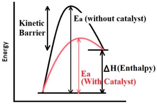 Representation of the kinetic barrier of the reaction and lowering the activation energy (Ea) using catalyst [15].