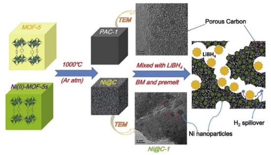 - Meng, X.; Wan, C.B.; Wang, Y.T.; Ju, X. Porous Ni@C derived from bimetallic Metal–Organic Frameworks and its application for improving LiBH4 dehydrogenation. J. Alloys Compd. 2018, 735, 1637–1647. [Google Scholar] [CrossRef]