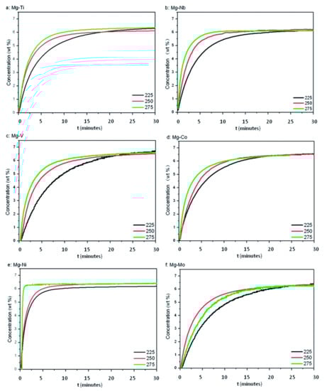 Isothermal hydrogenation curves of Mg–TM samples at 225, 250 and 275 °C. (a) Mg–Ti; (b) Mg–Nb; (c) Mg–V; (d) Mg–Co; (e) Mg–Ni; (f) Mg–Mo [104]. (Reprinted with permission from the Royal Society of Chemistry).