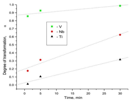 Dependences of the degree of transformation of Mg into its hydride on hydrogenation time during RT absorption with Ti, Nb or V additives [105]. (Reprinted with permission from Elsevier).