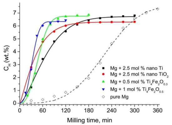 Hydrogen absorption by powder mixtures of Mg with Ti-based additives during reactive ball milling in hydrogen [119]. (Reprinted with permission from Elsevier).