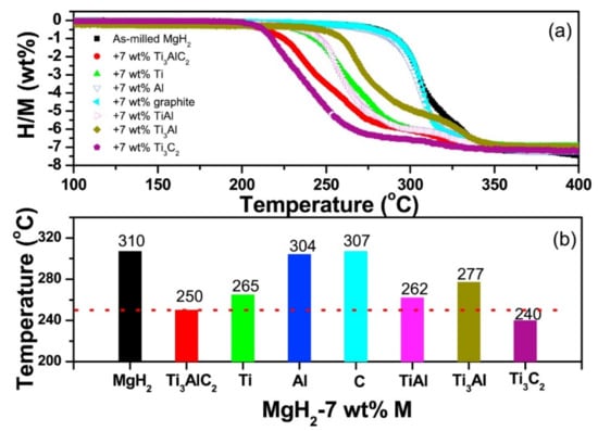 - Wang, K.; Du, H.; Wang, Z.; Gao, M.; Pan, H.; Liu, Y. Novel MAX-phase Ti3AlC2 catalyst for improving the reversible hydrogen storage properties of MgH2. Int. J. Hydrogen Energy 2017, 42, 4244–4251. [Google Scholar] [CrossRef]