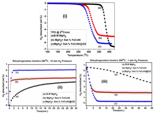 (i) TPD profile of (a) B.M MgH2 (uncatalyzed sample); (b) MgH2 + 5 wt% FeCoNi; (c) MgH2 + 5 wt% FeCoNi@GS. (ii) Rehydrogenation kinetics curve of (a) B.M MgH2; (b) MgH2 + 5 wt% FeCoNi; (c) MgH2 + 5 wt% FeCoNi@GS at 290 °C at 15 atm. (iii) Dehydrogenation kinetics curve of (a) B.M MgH2; (b) MgH2 + 5 wt% FeCoNi; (c) MgH2 + 5 wt% FeCoNi@GS at 290 °C at 1 atm [138]. (Reprinted with permission from Elsevier.)