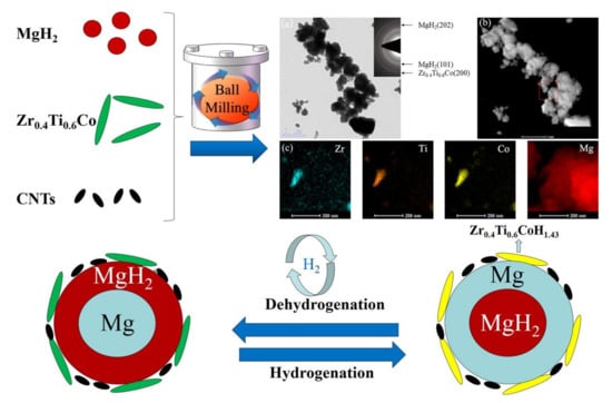 Preparation and investigation of MgH2-Zr0.4Ti0.6Co nanosheets and carbon nanotubes [145]. (Reprinted with permission from Elsevier.)