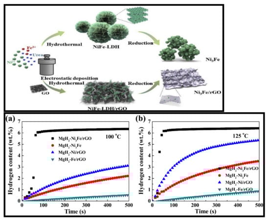Synthesis procedure for the Ni3Fe and Ni3Fe/rGO. The strong electrostatic effect between GO and LDH results in the formation of a load structure rather than a flower shape (upper panel). Isothermal rehydrogenation curves of MgH2-5 wt% Ni3Fe/rGO, MgH2-5 wt% Ni3Fe, MgH2-5 wt% Ni/rGO and MgH2-5 wt% Fe/rGO at 100 °C (a) and 125 °C (b) under 3.0 MPa hydrogen pressure [161]. (Reprinted with permission from Elsevier.)