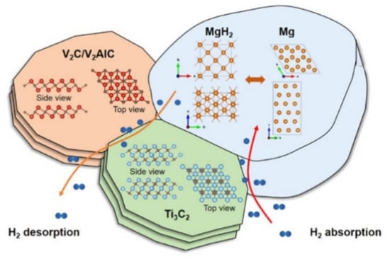 - Liu, H.; Lu, C.; Wang, X.; Xu, L.; Huang, X.; Wang, X.; Ning, H.; Lan, Z.; Guo, J. Combinations of V2C and Ti3C2 MXenes for Boosting the Hydrogen Storage Performances of MgH2. ACS Appl. Mater. Interfaces 2021, 13, 13235–13247. [Google Scholar] [CrossRef]