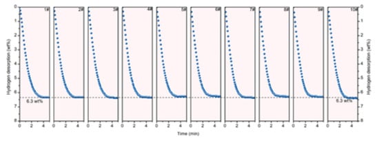 Cycling hydrogen desorption curves of MgH2–2V2C/Ti3C2 at 300 °C for up to 10 cycles [168]. (Reprinted with permission from the American Chemical Society.)