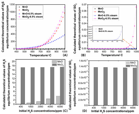 Theoretically calculated equilibrium concentrations with different inputs. (A,B): Equilibrium sulfur concentrations of MnO and MoO2 under dry or steam environments at different temperatures, (A): H2S, (B): SO2; (C,D): Equilibrium sulfur concentration of with different initial H2S concentrations at 600 °C, (C): H2S, (D): SO2.