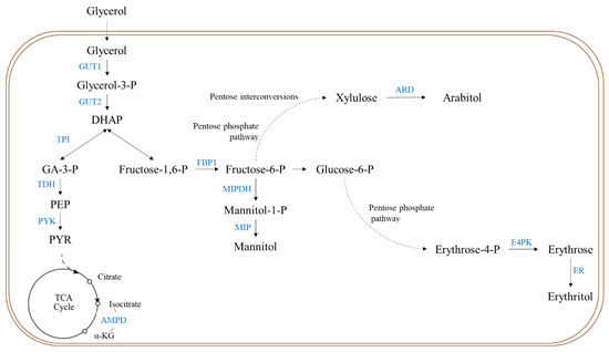 Metabolic pathways for polyols biosynthesis from glycerol. GUT1: glycerol kinase; GUT2: mitochondrial glycerol-3-phosphate dehydrogenase; DHAP: dihydroxyacetone phosphate; TPI: triose phosphate isomerase; GA-3-P: glyceraldehyde-3-phospate; TDH: glyceraldehyde-3-phosphate dehydrogenase; PEP: phosphoenolpyruvate; PYK: pyruvate kinase; PYR: pyruvate; FBP1: fructose bisphosphatase; Fructose-6-P: fructose-6-phosphate;M1PDH: mannitol-1-phosphate dehydrogenase; Manntiol-1-P: mannitol-1-phosphate; M1P: mannitol-1-phosphatase; Glucose-6-p: glucose-6-phosphate; ARD: arabitol dehydrogenase; E4PK: erythrose-4-phosphate kinase; ER: erythrose reductase. Adapted by [14].