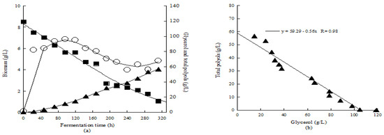 Kinetics of dry yeast cell mass production (○), total polyols biosynthesis (▲) and glycerol consumption (■) (a) and total polyols (▲) vs. remaining glycerol (b) by Yarrowia lipolytica FMCC Y-74 during cultivation on biodiesel-derived glycerol in shake flasks at 180 rpm, pH value of 3.5, incubation temperature T = 29 ± 1 °C. Each experimental point is the mean value of two independent determinations.