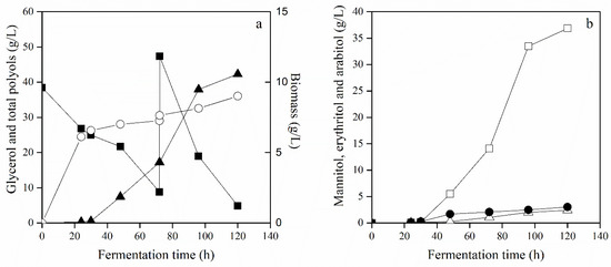 It must also be indicated that the distribution of polyols was significantly affected by the initial glycerol concentration. At initial glycerol concentrations of 60 and 80 g L−1, mannitol was the principal polyol, which was followed by erythritol and arabitol. Specifically, at Gly0 ≈ 60 g L−1, the final ratio of mannitol, erythritol, and arabitol was 0.66:0.17:0.17. Increasing the initial glycerol concentration (Gly0 ≈ 80 g L−1) led to an equal production of mannitol and erythritol, while arabitol production was lower. At elevated initial glycerol concentration (Gly0 ≈ 120 g L−1), mannitol and erythritol were mainly produced until t = 96 h; after that point, erythritol biosynthesis was enhanced. The final mannitol, erythritol, and arabitol ratio was 0.38:0.43:0.18.