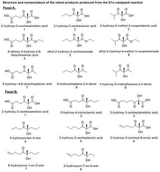 Structure of the chiral products formed by E. coli E1o in carboligation reaction by using different acceptors and substrates in Figure 2 (top and bottom) [69,97]. The formation of products 1 and 3 by using 2-OG and 2-OA as substrates and glyoxylate as an acceptor was also demonstrated for the human E1o [63,64,69]. Panel A represent all chiral products corresponding to Table 2. Panel B represent chiral products using carboxylic acids which are structurally similar to 2-oxo acids (2-oxoadipic acid, 2-ketohexanoic acid and 2-oxo-5-hexenoic acid) and acceptors (glyoxalate, butyraldehyde and propanal).