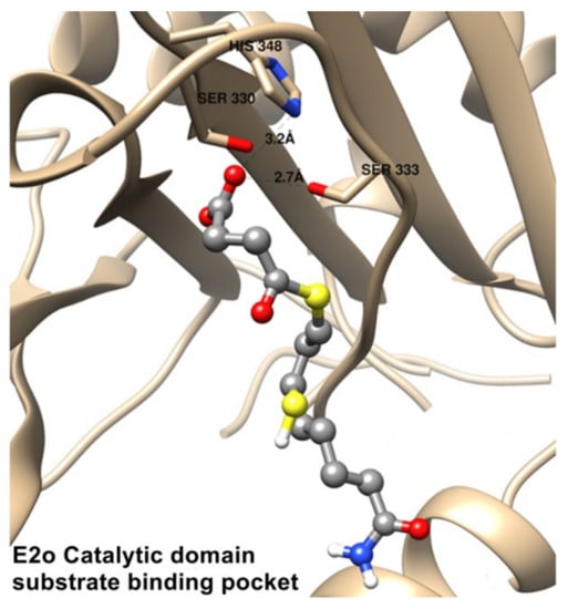 The succinyl-binding site of the E. coli E2o catalytic domain with succinyldihydrolipoamide modeled into it [110]. The succinyl-binding site contains residues Ser330 and Ser333 within hydrogen-bonding distance of the carboxylate group of succinyldihydrolipoamide. The His348 which may be responsible for substrate recognition is shown. The modeling was performed by using UCSF Chimera Autodock program [111] and coordinates of the E. coli E2o catalytic domain deposited under the accession number 1C4T [99].