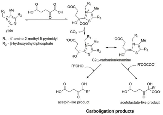 Mechanism of the carboligase side reaction forming acetoin and acetolactate suggested for YPDC and for E. coli pyruvate dehydrogenase [71].