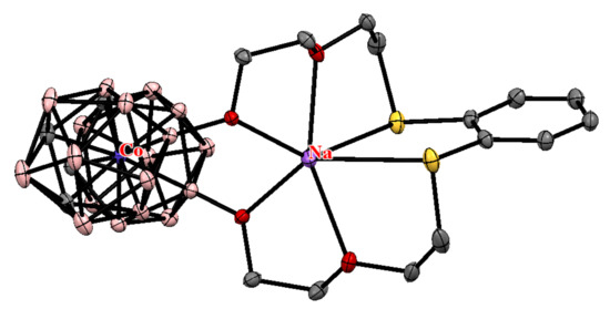 The crystal structure of sodium salt of [8,8′-(OCH2CH2OCH2CH2S)2-o-C6H4-3,3′-Co(1,2-C2B9H9)2]−, which was obtained during the drying of the solution of parent potassium salt in diethyl ether over Na2SO4, was determined by X-ray analysis [79] (Figure 3).