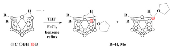 To date, oxonium derivatives of nido-carborane have been synthesized with all cyclic ethers used as common solvents, including tetrahydrofuran, 1,4-dioxane, and tetrahydropyran. The first oxonium derivative was obtained as early as 1969 by the reaction of the potassium salt of nido-carborane with FeCl3 in a mixture of benzene and tetrahydrofuran. The reaction gave a mixture of asymmetric 9-(CH2)4O-7,8-C2B9H11 and symmetric 10-(CH2)4O-7,8-C2B9H11 which were separated by column chromatography in benzene. Similar mixture of isomers was obtained for the C,C-dimethyl derivative of nido-carborane as well [59] (Scheme 1).
