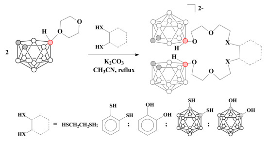 The reactions of two equivalents of 1,4-dioxane derivative of nido-carborane with 1,2-O,O’- and 1,2-S,S’-dinucleophiles (1,2-dihydroxybenzene [78], 1,2-dimercaptoethane, 1,2-dimercaptobenzene [79], 1,2-dihydroxy-closo-carborane, 1,2-dimercapto-closo-carborane[79]) in the presence of K2CO3 in acetonitrile makes it possible to obtain nido-carborane-based podands related to acyclic crown ether 18-crown-6 [78,79] (Scheme 7).