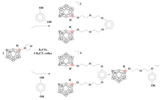 The reaction of two equivalents of 1,4-dioxane derivative of nido-carborane with resorcinol proceeds in a similar way, resulting in K2[1,3-(10-OC2H4OC2H4O-7,8-C2B9H11)2C6H4], whereas the reaction with hydroquinone leads to two products K2[1,4-(10-OC2H4OC2H4O-7,8-C2B9H11)2C6H4] and K[10-(4′-KOC6H4O)-CH2CH2OCH2CH2O-7,8-C2B9H11] [78] (Scheme 8).