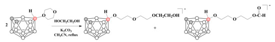 The reaction of two equivalents of 10-O(CH2CH2)2O-7,8-C2B9H11 with ethylene glycol in the presence of K2CO3 leads to the formation of carboranyl triethylene glycol ether [10-HO(CH2CH2O)3-7,8-C2B9H11]− along with a certain amount of carboranyl diethylene glycol formate [10-HC(O)O(CH2CH2O)2-7,8-C2B9H11]− [78] (Scheme 9).