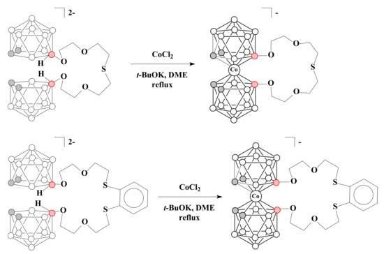 - Shmal’ko, A.V.; Stogniy, M.Y.; Kazakov, G.S.; Anufriev, S.A.; Sivaev, I.B.; Kovalenko, L.V.; Bregadze, V.I. Cyanide free contraction of disclosed 1,4-dioxane ring as a route to cobalt bis(dicarbollide) derivatives with short spacer between the boron cage and terminal functional group. Dalton Trans. 2015, 44, 9860–9878. [Google Scholar] [CrossRef] [PubMed]