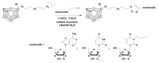 The obtained azides can be used for medical application due to the possibility of their conjugation with biomolecules by standard methods of bioorganic chemistry such as, for example, Cu(I)-catalyzed reaction of 1,3-dipolar [3 + 2] -cycloaddition of terminal azido group with alkynes (“click” reaction) [44,82,83,84,85,86]. Thus, several conjugates with nucleosides were prepared by Cu(I)-catalyzed click reaction of 10-N3CH2CH2OCH2CH2O-7,8-C2B9H11 with modified derivatives of 2′-deoxyadenosine [80], uridine and thymidine [81], containing terminal alkyne group (Scheme 13).