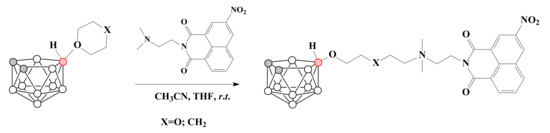 The charge-compensated nido-carborane-based conjugates with mitonafide were prepared in mild conditions by the ring-opening reactions of 1,4-dioxane and tetrahydropyran derivatives of nido-carborane with dimethylamino group of mitonafide [63] (Scheme 15).