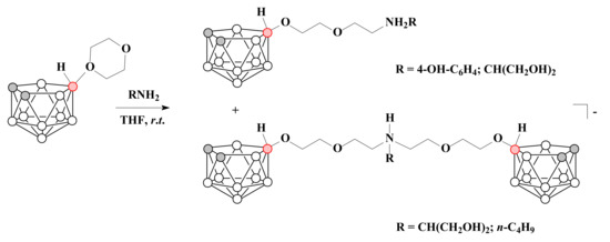 The reactions of 1,4-dioxane derivative of nido-carborane with 4-aminophenol in tetrahydrofuran in mild conditions led to the formation of the corresponding ammonium derivative 10-(4-OH-C6H4)-NH2CH2CH2OCH2CH2O-7,8-C2B9H11, whereas the treatment of 10-O(CH2CH2)2O-7,8-C2B9H11 with 2-amino-1,3-propanediol resulted in a mixture of 10-(HOCH2)2CHNH2CH2CH2OCH2CH2O-7,8-C2B9H11 and [(HOCH2)2CHNH-N,N-(10,10′-CH2CH2OCH2CH2O-7,8-C2B9H11)2]− [71]. At the same time the reaction with n-butylamine led only to [n-C4H9NH-(10-CH2CH2OCH2CH2O-7,8-C2B9H11)2]− [68] (Scheme 16).