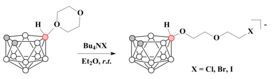 The reactions of 1,4-dioxane derivative of nido-carborane with halide ions from tetrabutylammonium salts Bu4NX in diethyl ether at room temperature led to the ring-opening of the cycle with the formation of the corresponding halogen derivatives [10-X-CH2CH2OCH2CH2O-7,8-C2B9H11]− (X = Cl, Br, I) [71] (Scheme 18).