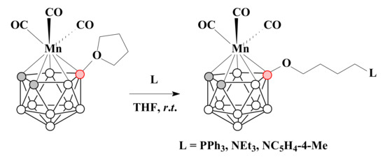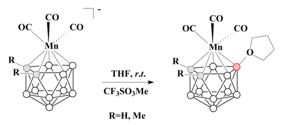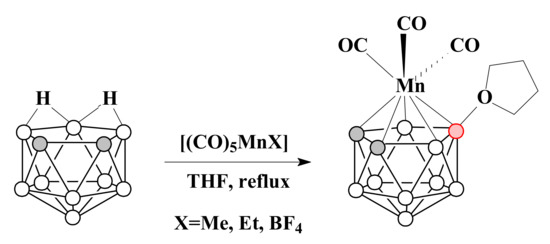 Thus, the reaction of protonated nido-carborane 7,8-nido-C2B9H13 with [(CO)5MnX] (X = Me, Et or BF4) in tetrahydrofuran results in [3,3,3-(CO)3-3-Mn(8-(CH2)4O-1,2-C2B9H10)] [89] (Scheme 21). The molecular structure of this complex was determined by X-ray diffraction [89] (Figure 6).