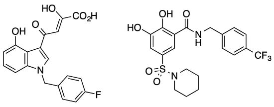 In the context of HIV-1 infection, IN was successfully targeted for drug development [3]. Raltegravir (MK-0518) [4,5] was approved by the Food and Drug Administration in 2007, and other integrase inhibitors (INI), including Elvitegravir (GS-9137) [6,7], are progressing through clinical development [8]. The breakthrough of INI has produced a great impulse in the use of multiple drugs that act on different viral targets, known as Highly Active Antiretroviral Therapy (HAART) [9]. Important examples of this class are the lens epithelium-derived growth factor (LEDGF) inhibitors [10,11,12] (Figure 1).