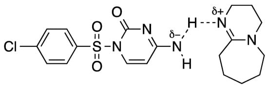 Firstly, the mixture of 2 and benzyl bromide was dissolved in DMSO and left at 25 °C for 4 h, then it was allowed to reach 80 °C and was kept under these conditions for a further 20 h, but no reaction took place and the starting materials remained completely unconsumed (Table 1, entry 1). Next, the exploitation of non-nucleophilic bases was investigated. In detail, pyridine (Pyr) and triethylamine (TEA) were found to be ineffective (Table 1, entries 2–4) and only a trace of the desired product was achieved when bicyclic amide (1,8-diazabiciclo(5.4.0)undec-7ene, (DBU)) [43,44]—which is able to form a charge transfer complex—was employed. The low nucleophilicity of the nitrogen atom, as well as the steric hindrance on the same nitrogen, resulting in a stalled reaction, could be clarified by the supposed complex reported in Figure 3.