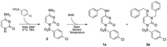 Based on the entire experimental outcome and the reported literature [45,46,47], we postulated that the undesired dibenzylated byproduct 3a might be due to the competitive pathway illustrated [47] in Scheme 2, where the nucleophilic substitution of benzyl bromide first occurs by the NH2(N4) group and then by the cytosine N3 site of the bidentate nucleophile.