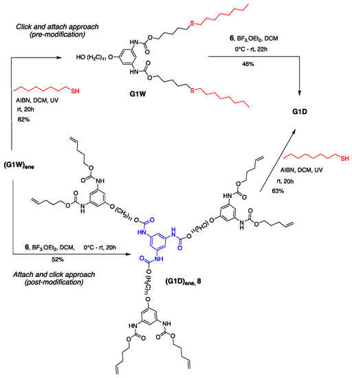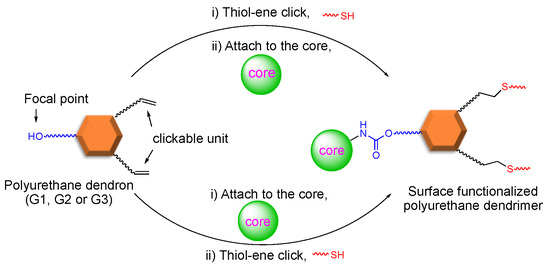 - Poudel, D.P.; Taylor, R.T. A Model for Late-Stage Modification of Polyurethane Dendrimers Using Thiol—Ene Click Chemistry. ACS Omega 2021, 6, 12375–12381. [Google Scholar] [CrossRef]