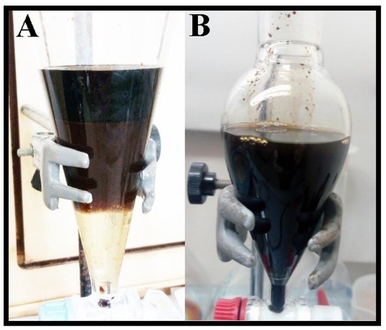 This initial screening pointed out the cork bio-oil as the one with the most promising properties. Additionally, as cork biomass is a subproduct of major interest for Portuguese industry, the subsequent studies were mostly focused on adding acid or basic aqueous solutions to the cork bio-oil samples in a 50:50 vol.% mix. The tested solutions consisted of 2 M H2SO4 and 2 M KOH. Both mixtures formed emulsions with different behavior (Figure 1). Following a rest period of 24 h, the cork bio-oil acidic emulsion led to three distinct phases (Figure 1A). On the other hand, the cork bio-oil alkaline emulsion did not originate any visible phase separation (Figure 1B). The lack of formation of visible distinct phases in the alkaline emulsion is possibly related to the formation of phenolates, which are hydrophilic. In opposition, neutralizing such phenolates in the acidic bio-oil emulsion leads to phase separation.