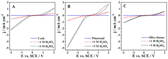 The CV experiments were performed at 50 mV s−1 in the cork, pinewood, and olive stones bio-oil samples with up to 3 M H2SO4 (Figure 2). Note that the samples with KOH addition had such a high viscosity that correct measurement of the CVs was prevented. The behavior of the three bio-oils was similar, with all samples showing an increase in current densities with the concentration of H2SO4, especially in the cathodic zone. The CVs show no visible redox peaks. A large increase of current density in the cathodic zone is expected, as the pH decrease promoted by the addition of acid enhances the HER, the only reaction visible in this zone.