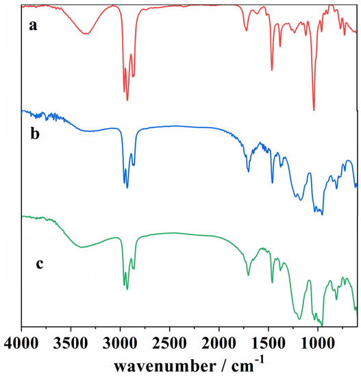 The visible decrease of these three peaks suggests the reduction of species in solution during electrolysis (e.g., esters, alcohols). This may indicate the hydrogenation of compounds like furans, such as the hydrogenation of furfuryl alcohol into 2-methylfuran. The hydrogenation of furans is supported by the reduction of the peak at 1234–1230 cm−1, as one of the possible reaction pathways may involve breaking the cyclic ring [53,54,55,56]. One can also observe that the spectra in Figure 9 are very similar to the spectrum of the original bio-oil sample (spectrum (a) in Figure 8), suggesting loss of H+ ions due to migration through the polymeric membrane.