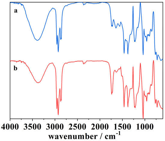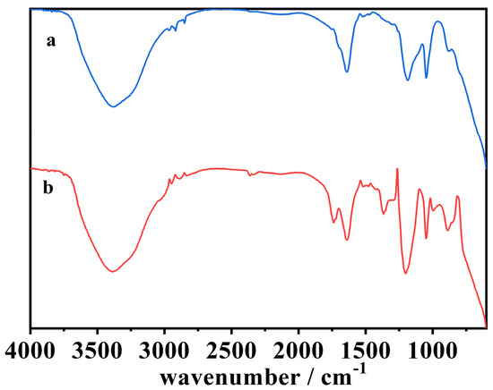 Figure 10 shows the ATR-FTIR spectra of the aqueous phase of the blank cork bio-oil acidic emulsion, not subjected to electrolysis, and the same aqueous phase extracted after Electrolysis II, a bulk electrolysis experiment in a single-compartment cell. In general, organic compounds are relatively non-polar; however, the derivatives from the breakdown of plant biomass that compose these bio-oils are highly oxygenated compounds, which increases their solubility, especially those derived from cellulose, whose hydrocarbon chains are shorter [53]. Thus, this aqueous phase was expected to be composed of light oxygenates and oxygenated aromatics. This is supported by the lack of peaks between 2949–2850 cm−1, related to the vibration of aliphatic hydrocarbon chains, and the presence of peaks at 1725–1705 cm−1 and between 1250 and 1000 cm−1, related to strongly oxygenated radicals (spectrum (a) of Figure 10). After Electrolysis II (spectrum (b)), it is visible the appearance of a peak at 1750–1735 cm−1 related to the –C=O stretching vibration and an increase in the intensity of the three following peaks: