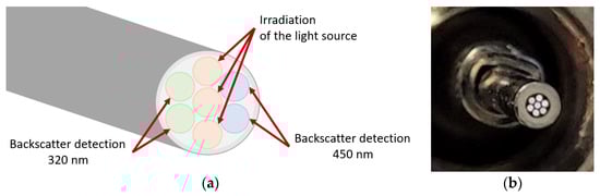 The light source was an XD 6265-08TJ deuterium lamp from Heraeus Noblelight (Hanau, Germany). It provided a constant spectrum with the highest intensity in the UV range of 160–400 nm. The light from the lamp passed through a lens with a focal length of 12 mm and was focused into a fiber bundle consisting of three individual fibers. These fibers guided the light to a rod probe fixed in the half-shell reactor. The rod probe had an outer diameter of 1.6 mm and a bundle of seven glass fibers were glued inside it. A similar probe principle has already been successfully tested for monitoring dispersed surfaces in crystallization in the work of Schmitt et al. [17]. Figure 1 shows the arrangement of the fibers. The middle three fibers were connected to the light source and radiated the light into the reactor and onto the sample. The two left and right fibers were connected to the detection modules. This fiber arrangement was chosen so that the detection fibers would be located at the same distance from the irradiated light, thus minimizing location-dependent differences in backscatter.